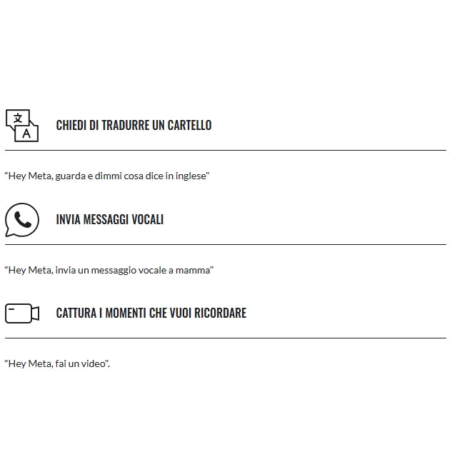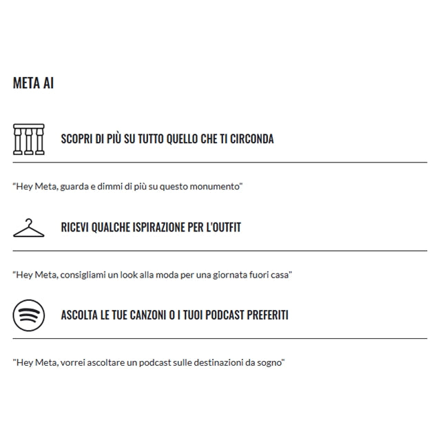 Chatta con Meta AI e ricevi suggerimenti e risposte ovunque ti trovi. Chiedi ai tuoi AI Glasses di aiutarti a trovare idee per la cena o ricordarti dove hai parcheggiato. Scopri di più sui luoghi che visiti durante i tuoi viaggi e conversa in oltre 6 lingue grazie alla traduzione in tempo reale, anche senza Wi-Fi.